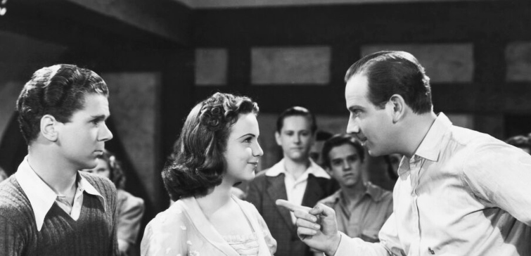 Continuing Deanna Durbin's filmography, I still had this on my list of unseen films. I love Durbin and I love Melvyn Douglas but somehow I was never eager to watch this film as it deals with a teenager having a crush on an older man. I always fear it gets uncomfortable or embarrassing situations will arise. And sure enough ... though Douglas was just friendly with Deanna, she misinterpreted his feelings, blinded by her crush. But fortunately things didn't get that embarrassing. I'm also glad Douglas wasn't tempted by Durbin's youth and beauty and didn't behave flirty with her, just treated her like a kid. I liked the scene in the beginning where the teens are haunting the guest house where Douglas is staying but he finds them out soon enough. Deanna is lovely anyway, and I like her in her teen roles — she reminds me of Judy Garland as a teenager. With some pleasant songs and nice support by Jackie Cooper, Irene Rich, Nancy Carroll (with very little screen time, only making her entrance 8 minutes before the end) and John Halliday, this was an entertaining watch despite my misgivings. And the little girl Juanita Quigley was both cute and annoying. (Photos: Deanna Durbin and Jackie Cooper / Jackie Cooper, Deanna Durbin and Melvyn Douglas / Deanna Durbin, Melvyn Douglas and Nancy Carroll)